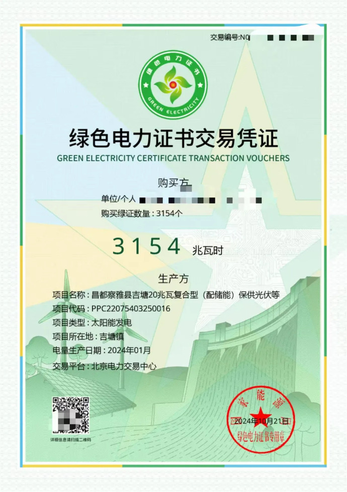 綠色電力證書交易憑證。