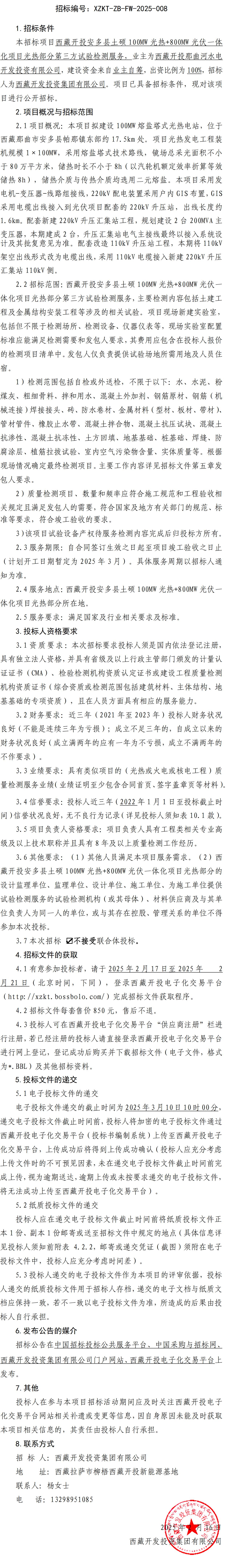 西藏開投安多縣土碩100MW光熱+800MW 光伏一體化項目光熱部分第三方試驗檢測服務招標公告